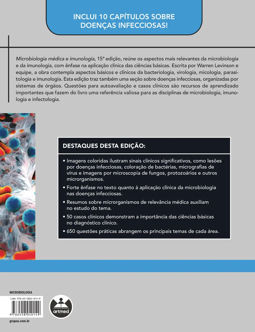 Uma das principais referências na área, Microbiologia médica e imunologia é também um dos livros de microbiologia atualizados com maior frequência. Esta 15ª edição chega ao mercado em um momento em que os microrganismos de relevância médica estão em grande evidência, devido ao impacto que podem gerar na saúde do planeta. Adotado em inúmeras instituições de ensino, o livro de Warren Levinson e equipe está cada vez mais comprometido com a aplicação clínica das ciências básicas da saúde.
