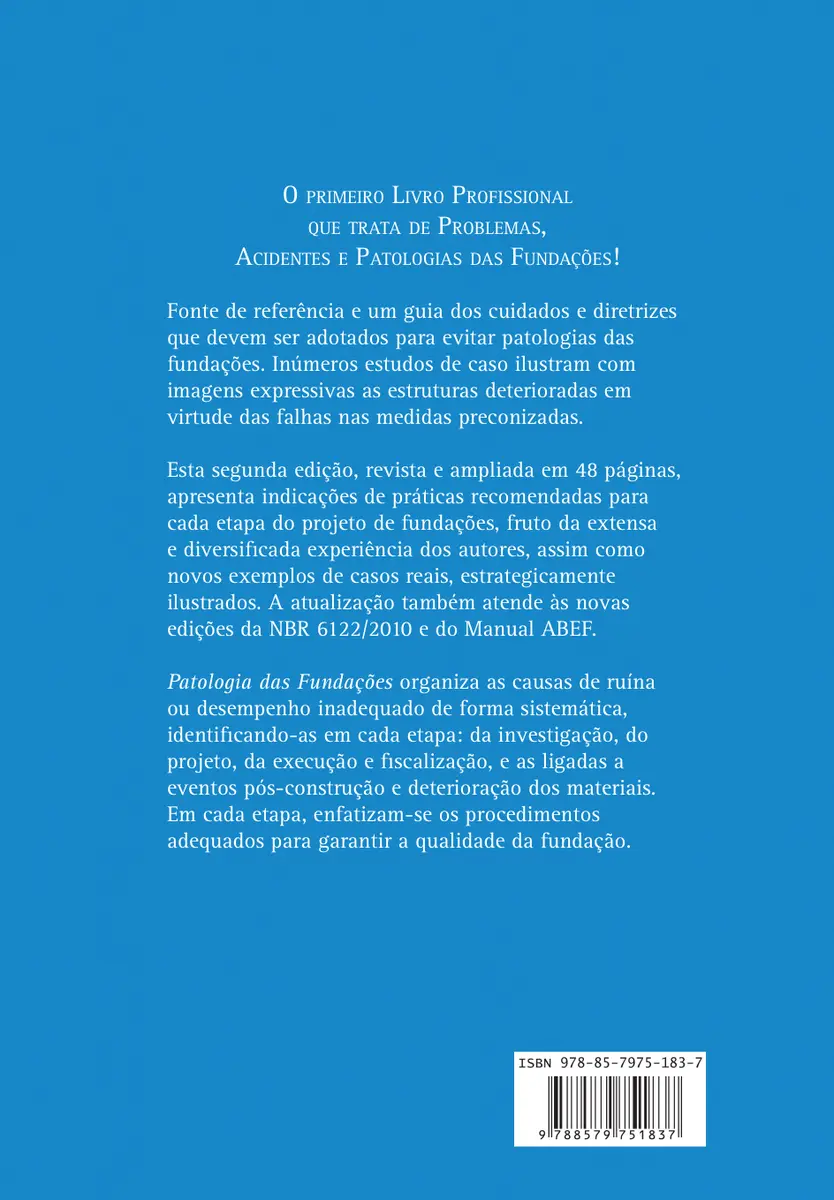 Patologia das Fundações organiza as causas de ruína ou desempenho inadequado de forma sistemática, identificando-as em cada etapa: da investigação, do projeto, da execução e fiscalização, e as ligadas a eventos pós-construção e deterioração dos materiais. Em cada etapa, enfatizam-se os procedimentos adequados para garantir a qualidade da fundação.