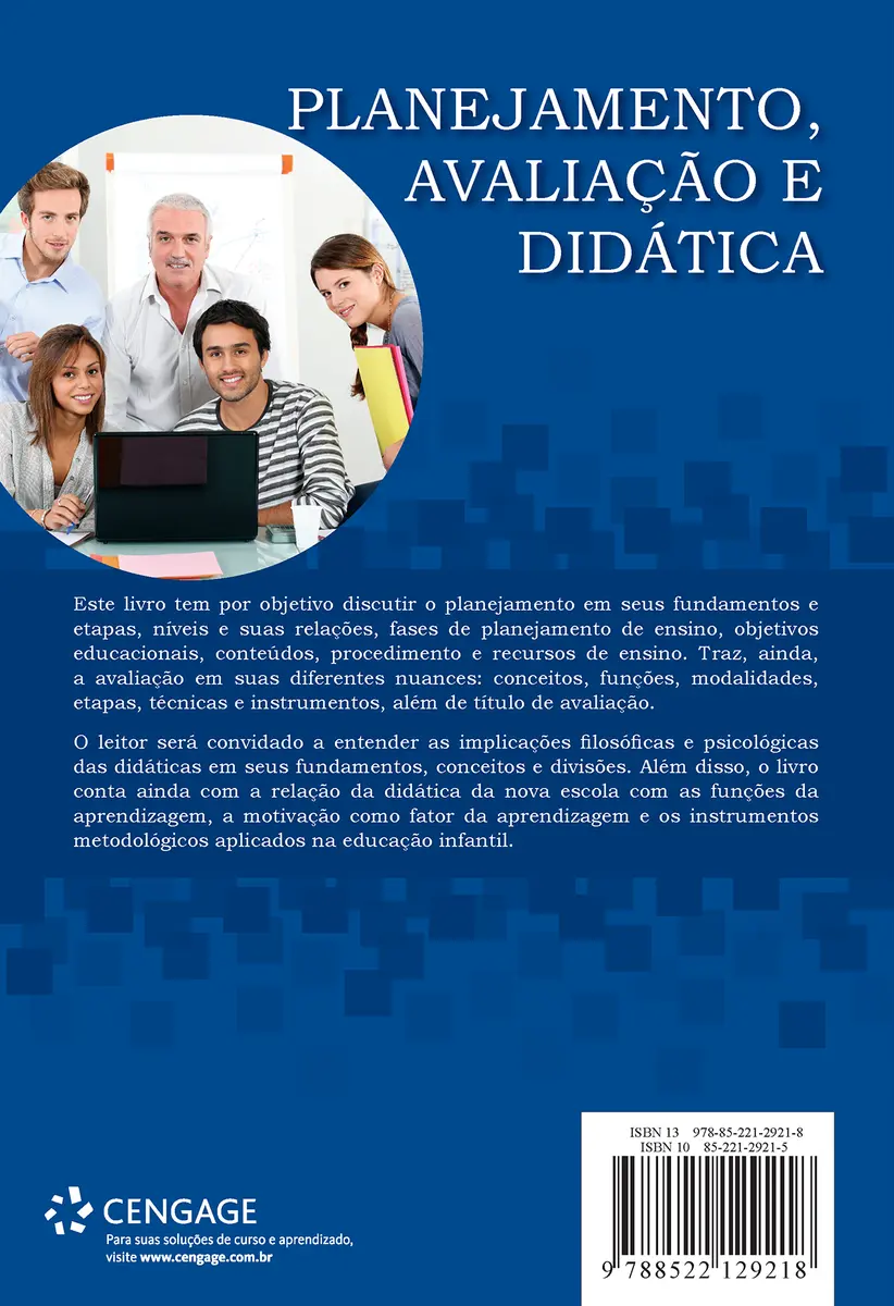 Este livro tem por objetivo discutir o planejamento em seus fundamentos e etapas, níveis e suas relações, fases de planejamento de ensino, objetivos educacionais, conteúdos, procedimento e recursos de ensino. Traz, ainda, a avaliação em suas diferentes nuances: conceitos, funções, modalidades, etapas, técnicas e instrumentos, além de título de avaliação.
