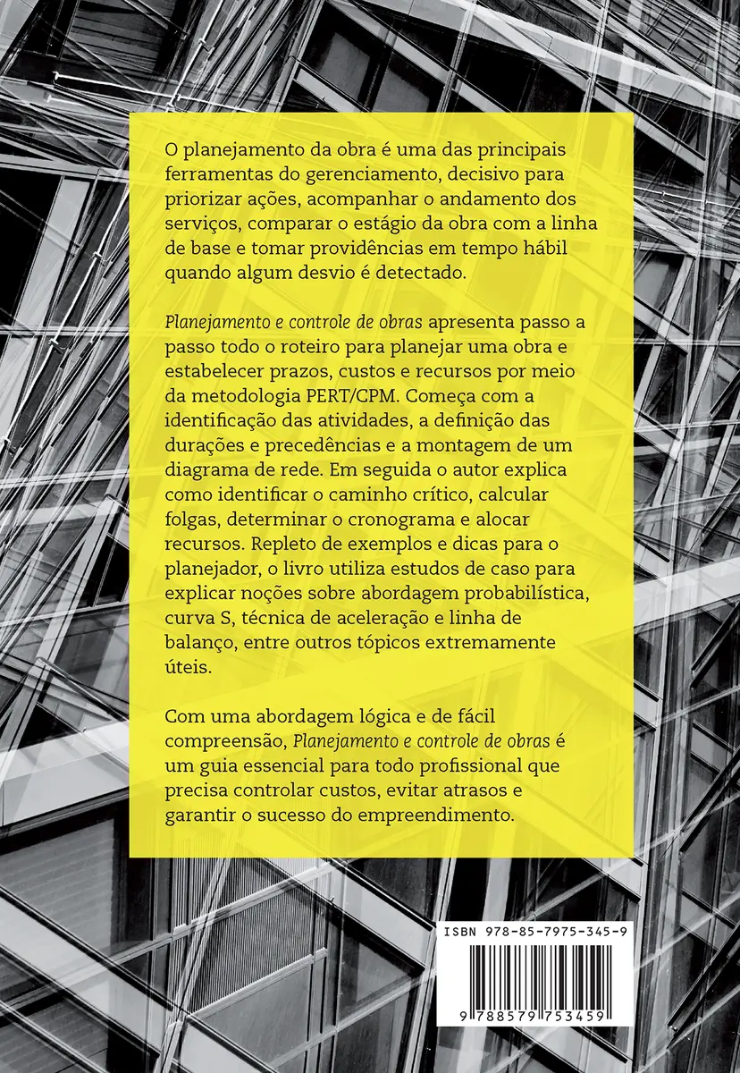 O planejamento da obra é uma das principais ferramentas do gerenciamento, decisivo para priorizar ações, acompanhar o andamento dos serviços, comparar o estágio da obra com a linha de base e tomar providências em tempo hábil quando algum desvio é detectado. Planejamento e controle de obras apresenta passo a passo todo o roteiro para planejar uma obra e estabelecer prazos, custos e recursos por meio da metodologia PERT/CPM. Começa com a identificação das atividades, definição das durações e precedências, e com a montagem de um diagrama de rede. Em seguida o autor explica como identificar o caminho crítico, calcular folgas, determinar o cronograma e alocar recursos. Repleto de exemplos e dicas para o planejador, o livro utiliza estudos de caso para explicar noções sobre abordagem probabilística, curva S, técnica de aceleração e linha de balanço, entre outros tópicos extremamente úteis. Com uma abordagem lógica e de fácil compreensão, Planejamento e controle de obras é um guia essencial para todo profissional que precisa controlar custos, evitar atrasos e garantir o sucesso do empreendimento.