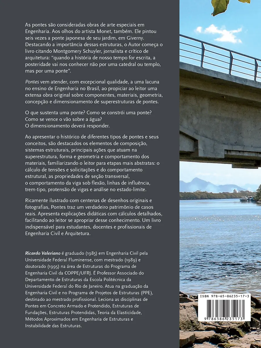 As pontes são consideradas obras de arte especiais em Engenharia. Aos olhos do artista Monet, também. Ele pintou seis vezes a ponte japonesa de seu jardim, em Giverny. O Autor começa o livro citando Montgomery Schuyler, jornalista e crítico de arquitetura: “quando a história de nosso tempo for escrita, a posteridade vai nos conhecer não por uma catedral ou templo, mas por uma ponte”. Pontes vem atender, com excepcional qualidade, a uma lacuna no ensino de Engenharia no Brasil, ao propiciar ao leitor uma extensa obra original sobre componentes, materiais, geometria, concepção e dimensionamento de superestruturas de pontes. O que sustenta uma ponte? Como se constrói uma ponte? Como se vence o vão sobre a água? O dimensionamento deverá responder. Ao apresentar o histórico de diferentes tipos de pontes e seus conceitos, são destacados os elementos de composição, sistemas estruturais, principais ações que atuam na superestrutura, forma e geometria e comportamento dos materiais, familiarizando o leitor para etapas mais abstratas: o cálculo de tensões e solicitações e do comportamento estrutural, as propriedades de seção transversal, o comportamento da viga sob flexão, linhas de influência, trem-tipo, protensão de vigas e análise no estado-limite. Ricamente ilustrado com centenas de desenhos originais e fotografias, Pontes traz um verdadeiro patrimônio de casos reais. Apresenta explicações didáticas com cálculos detalhados, facilitando ao leitor se apropriar desse conhecimento. Um livro indispensável para estudantes, docentes e profissionais de Engenharia Civil e Arquitetura.
