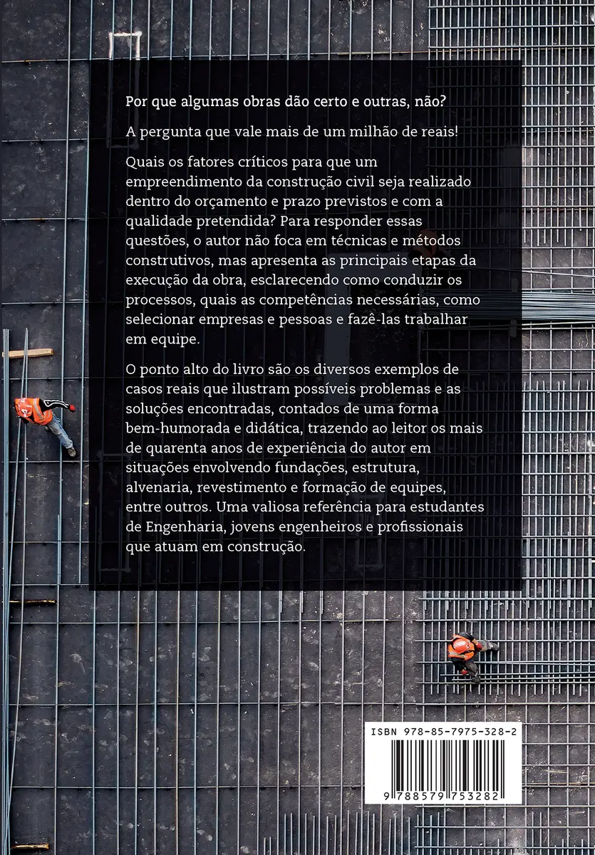 Por que algumas obras dão certo e outras, não? A pergunta que vale mais de um milhão de reais! Quais os fatores críticos para que um empreendimento da construção civil seja realizado dentro do orçamento e prazo previstos e com a qualidade pretendida? Para responder essas questões, o autor não foca em técnicas e métodos construtivos, mas apresenta as principais etapas da execução da obra, esclarecendo como conduzir os processos, quais as competências necessárias, como selecionar empresas e pessoas e fazê-las trabalhar em equipe. O ponto alto do livro são os diversos exemplos de casos reais que ilustram possíveis problemas e as soluções encontradas, contados de uma forma bem-humorada e didática, trazendo ao leitor os mais de quarenta anos de experiência do autor em situações envolvendo fundações, estrutura, alvenaria, revestimento e formação de equipes, entre outros. Uma valiosa referência para estudantes de Engenharia, jovens engenheiros e profissionais que atuam em construção.