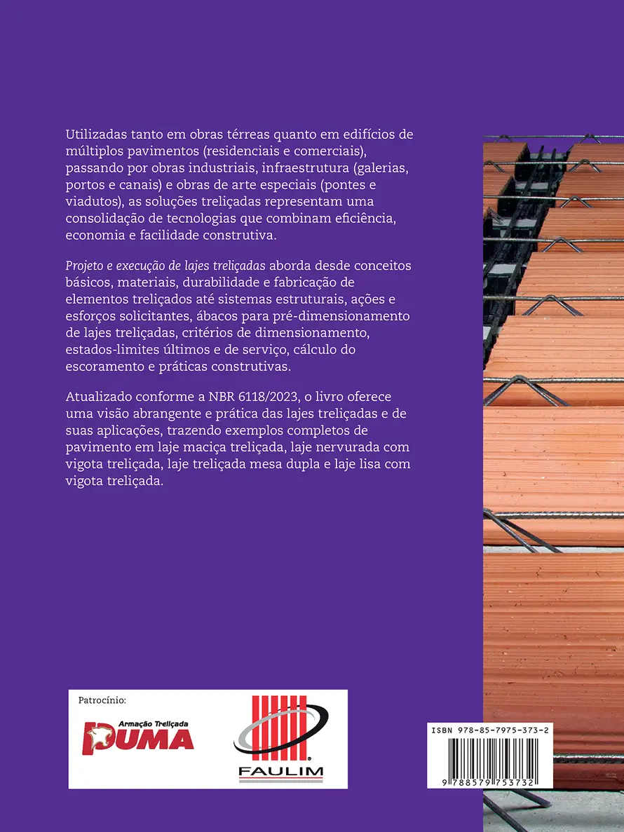 Para que tenham um comportamento estrutural seguro e funcional, é essencial haver um projeto de qualidade, que por sua vez exige conhecimento para a correta definição dos materiais e das ações, uso de um modelo estrutural adequado, dimensionamento à flexão e ao cisalhamento segundo as prescrições da Norma, e atendimento aos detalhes construtivos necessários. Projeto e execução de lajes treliçadas descreve todas essas etapas com profundidade, precisão e didática, além de apresentar ótimos exemplos de aplicação prática de toda a teoria e de todos os conceitos envolvidos. Devidamente atualizado e em conformidade com a NBR 6118/2023.