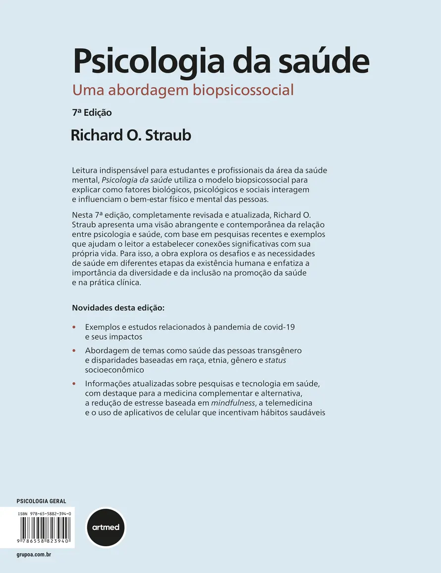 Nesta 7ª edição de Piscologia da saúde, inteiramente revisada e atualizada, Richard O. Straub utiliza o modelo biopsicossocial como parâmetro para abordar os conceitos de bem-estar físico e mental e a forma como eles se inter-relacionam, com exemplos que ajudam o leitor a conectar os conceitos à própria vida.