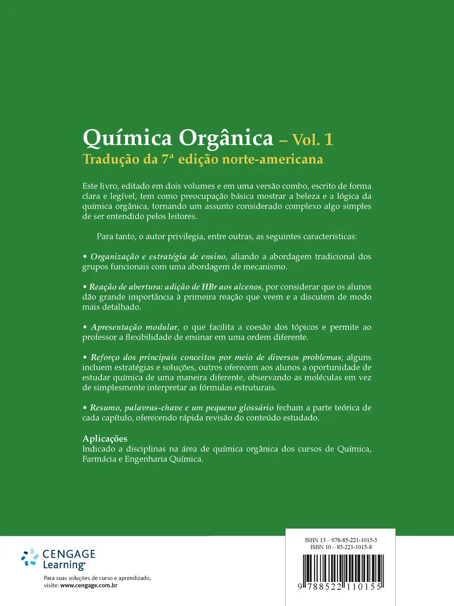 Este livro, editado em dois volumes e em uma versão combo, foi escrito de forma clara e legível, com a preocupação básica de mostrar a beleza e a lógica da química orgânica, tornando um assunto considerado complexo algo simples de ser entendido pelos leitores. Para tanto, o autor privilegia, entre outras, as seguintes características: . organização e estratégia de ensino, aliando a abordagem tradicional dos grupos funcionais a uma abordagem mecanicista; . emprego da reação de adição de HBr aos alcenos, por considerar que os alunos normalmente dão grande importância à primeira reação que eles vêem e discutem de forma mais detalhada; . síntese orgânica, tratada como um dispositivo de ensino que auxilia os alunos a organizar e a lidar com um alto grau de informações reais.
