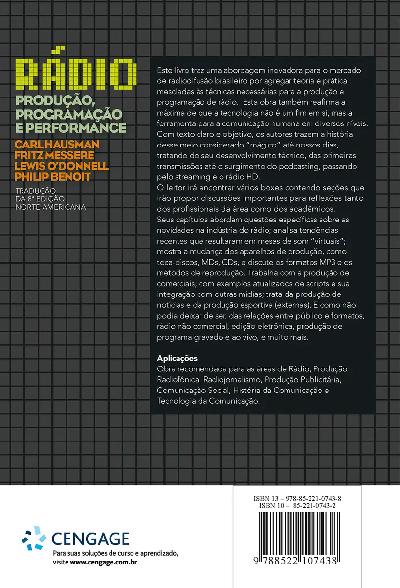 Este livro traz uma abordagem inovadora para o mercado de radiodifusão brasileiro por agregar teoria e prática mescladas às técnicas necessárias para a produção e programação de rádio. Esta obra também reafirma a máxima de que a tecnologia não é um fim em si, mas a ferramenta para a comunicação humana em diversos níveis. Com texto claro e objetivo, os autores trazem a história desse meio considerado 'mágico' até nossos dias, tratando do seu desenvolvimento técnico, das primeiras transmissões até o surgimento do podcasting, passando pelo streaming e o rádio HD. O leitor irá encontrar vários boxes contendo seções que irão propor discussões importantes para reflexões tanto dos profissionais da área como dos acadêmicos. Seus capítulos abordam questões específicas sobre as novidades na indústria do rádio; analisa tendências recentes que resultaram em mesas de som 'virtuais'; mostra a mudança dos aparelhos de produção, como toca-discos, MDs, CDs, e discute os formatos MP3 e os métodos de reprodução. Trabalha com a produção de comerciais, com exemplos atualizados de scripts e sua integração com outras mídias; trata da produção de notícias e da produção esportiva (externas). E como não podia deixar de ser, das relações entre público e formatos, rádio não comercial, edição eletrônica, produção de programa gravado e ao vivo, e muito mais.
