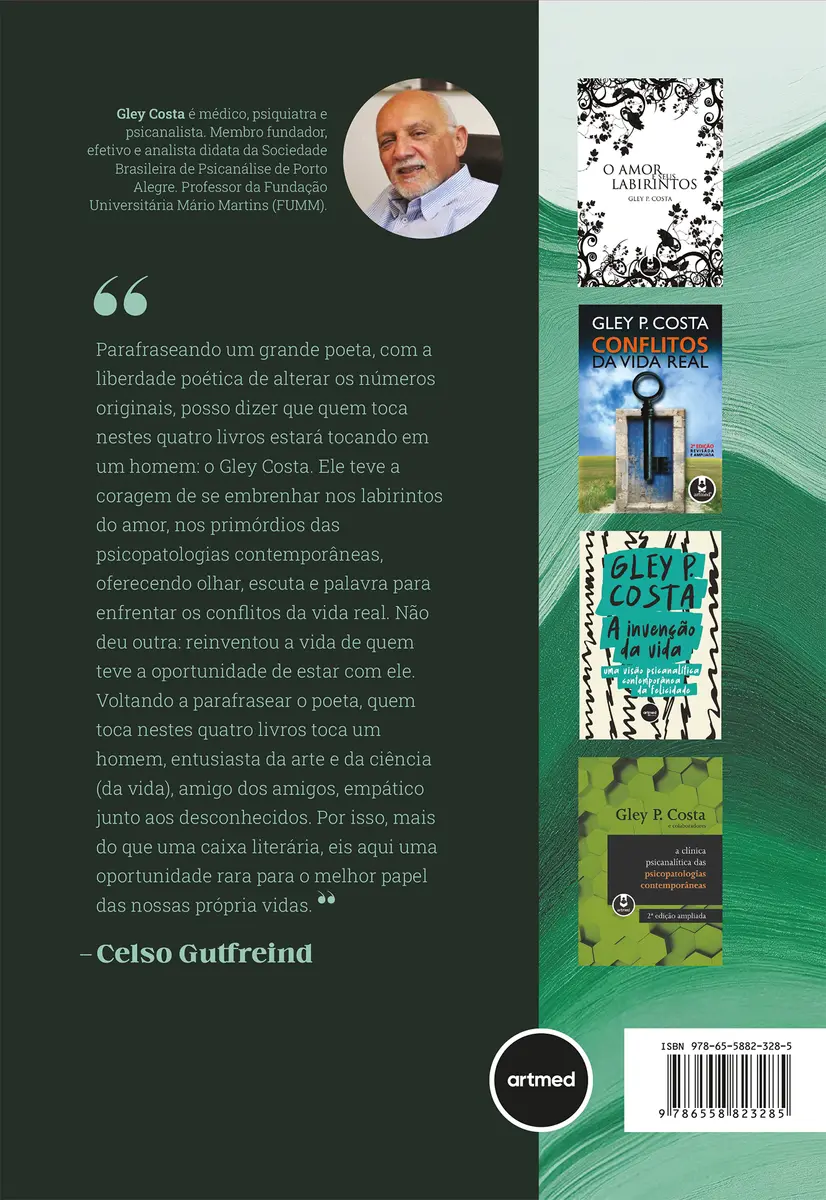 Parafraseando um grande poeta, com a liberdade poética de alterar os números originais, posso dizer que quem toca nestes quatro livros estará tocando em um homem: o Gley Costa. Ele teve a coragem de se embrenhar nos labirintos do amor, nos primórdios das psicopatologias contemporâneas, oferecendo olhar, escuta e palavra para enfrentar os conflitos da vida real. Não deu outra: reinventou a vida de quem teve a oportunidade de estar com ele. Voltando a parafrasear o poeta, quem toca nestes quatro livros toca um homem, entusiasta da arte e da ciência (da vida), amigo dos amigos, empático junto aos desconhecidos. Por isso, mais do que uma caixa literária, eis aqui uma oportunidade rara para o melhor papel das nossas própria vidas.