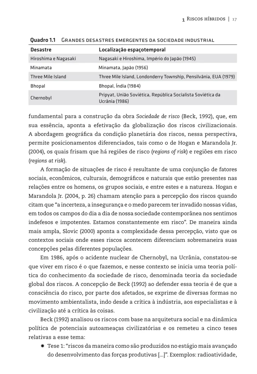 A população está continuamente exposta a riscos naturais, tecnológicos e sociais, como deslizamentos e inundações, acidentes em usinas ou barragens, poluição, fome e violência, em geral simultâneos, com a inter-relação de diferentes fatores, conceituando os riscos híbridos. O diagnóstico e o monitoramento desses riscos por grupos sociais, instituições e empresas são essenciais para o planejamento e a implementação de medidas de prevenção e controle. Este livro discute temas relacionados a riscos socioambientais urbanos, vulnerabilidade e resiliência, riscos hidrometeorológicos, índice DRIB, deslizamentos e gestão de riscos de desastres, abrangidos sob o conceito de riscos híbridos, permitindo debater políticas voltadas à prevenção e à redução dos impactos potenciais decorrentes desses riscos.