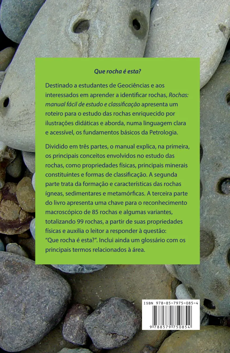 Rochas: manual fácil de estudo e classificação apresenta um roteiro para o estudo das rochas, enriquecido por ilustrações didáticas, e aborda, numa linguagem clara e acessível, os fundamentos básicos da Petrologia, ramo da geologia responsável pelo estudo de origem, ocorrência, estrutura e história das rochas.