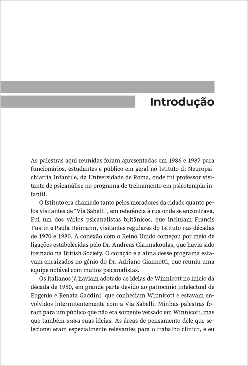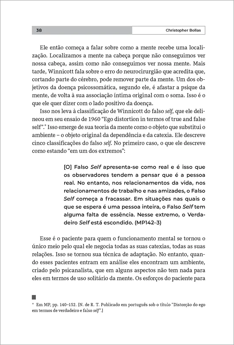 Leitura essencial para mergulhar no legado de um dos mais importantes psicanalistas contemporâneos, Solidão essencial reúne uma série de palestras sobre D.W. Winnicott ministradas por Christopher Bollas no Instituto de Neuropsiquiatria Infantil da Universidade de Roma. Bollas não apenas aborda a questão “Como os conceitos de Winnicott são aplicados no espaço clínico?”, mas também escreve sobre suas próprias formulações clínicas, como 'o objeto transformacional' ou 'o conhecido não pensado'.