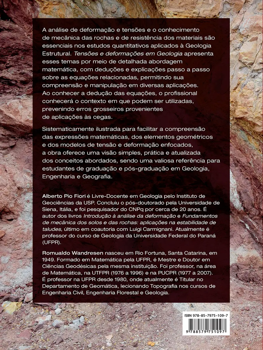 A análise de deformação e tensões e o conhecimento de mecânica das rochas e de resistência dos materiais são essenciais nos estudos quantitativos aplicados à Geologia Estrutural. O livro apresenta esses temas por meio de detalhada abordagem matemática, com deduções e explicações passo a passo sobre as equações relacionadas, permitindo sua compreensão e manipulação em diversas aplicações. Ao conhecer a dedução das equações, o profissional conhecerá o contexto em que podem ser utilizadas, prevenindo erros grosseiros provenientes de aplicações às cegas.