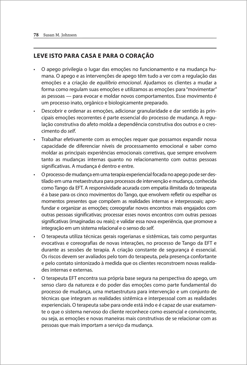 Com base em pesquisas de ponta sobre o apego adulto – e apresentando um roteiro inovador para a prática clínica –, Susan M. Johnson argumenta que a psicoterapia é mais eficaz quando se concentra no poder da conexão emocional. Principal desenvolvedora da terapia focada nas emoções (EFT) para casais, Johnson agora estende sua abordagem baseada no apego a indivíduos e famílias. Este livro mostra como a EFT se alinha perfeitamente à teoria do apego, de Bowlby, ao prover técnicas comprovadas para tratar ansiedade, depressão e problemas de relacionamento. Cada modalidade (terapia individual, de casal e de família) é abordada em capítulos que introduzem conceitos-chave e apresentam um exemplo de caso detalhado. O livro inclui, ainda, exercícios e questões para reflexão.