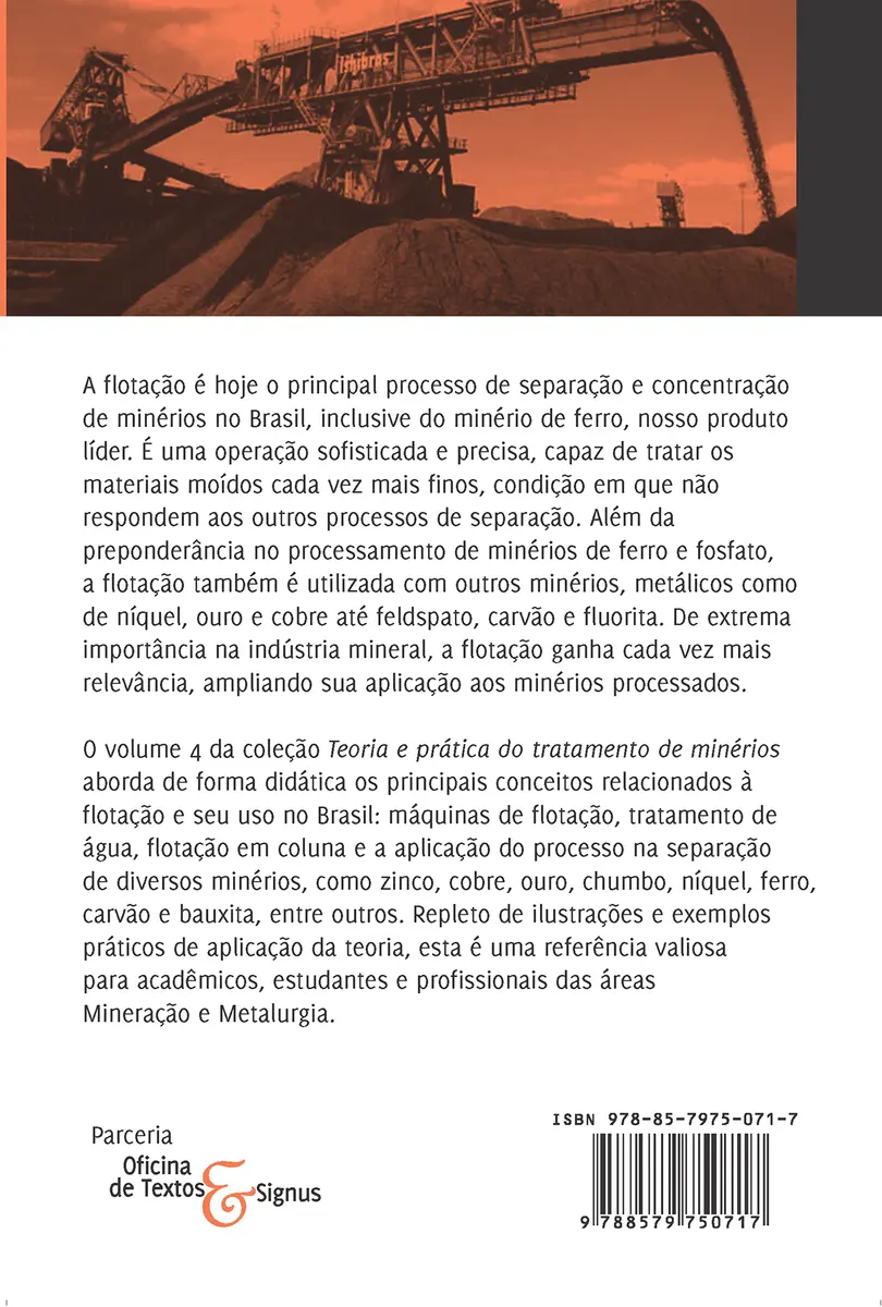Quarto volume da coleção Teoria e Prática do Tratamento de Minérios, organizado pelo Professor Arthur Pinto Chaves, esta é a principal obra sobre flotação já publicada no Brasil. Os textos, de autoria dos principais especialistas brasileiros nesta questão tão importante para o tratamento de minérios, abrangem as tecnologias de flotação dos principais minerais e outros tópicos como Máquinas de Flotação, Flotação em Coluna, Tratamento de Águas para Flotação, Pesquisa e Desenvolvimento em Flotação e Reagentes.