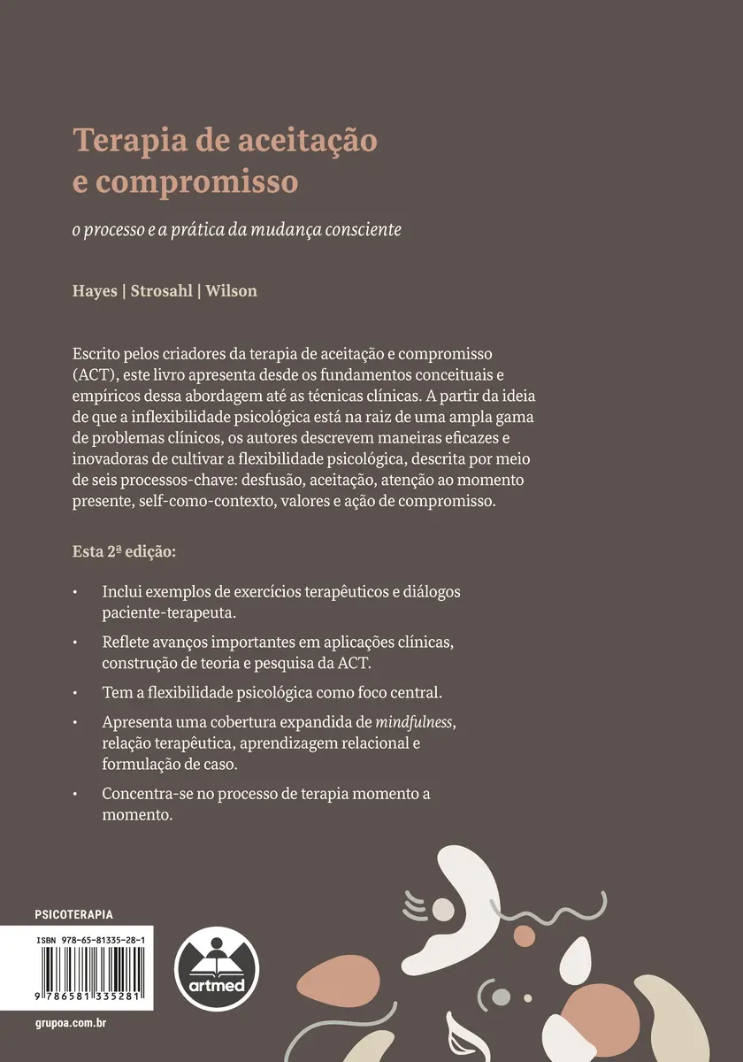 A partir da ideia de que a inflexibilidade psicológica está na raiz de uma ampla gama de problemas clínicos, os autores, criadores da terapia de aceitação e compromisso (ACT), descrevem maneiras eficazes e inovadoras de cultivar a flexibilidade psicológica, descrita por meio de seis processos-chave: desfusão, aceitação, atenção ao momento presente, self-como-contexto, valores e ação de compromisso.