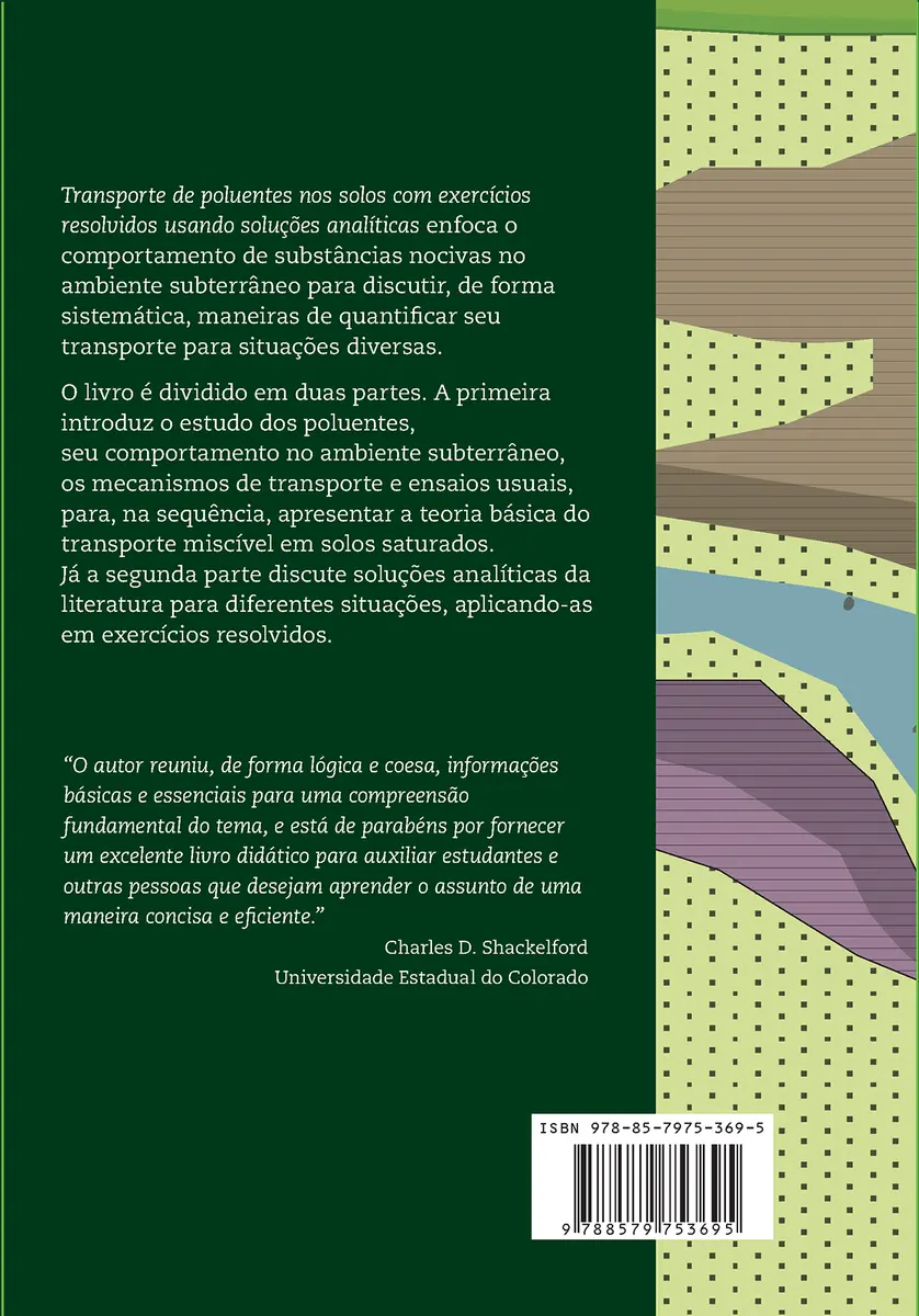 A proteção dos recursos hídricos e dos solos inclui a elaboração de projetos para a adequada disposição de resíduos, rejeitos e efluentes e a investigação, remediação e monitoramento de solos contaminados, o que, por sua vez, implica o estudo do transporte de poluentes no solo e nas águas subterrâneas, com o objetivo de prevenir os impactos negativos da contaminação ambiental. É nesse contexto que se insere o livro Transporte de poluentes nos solos com exercícios resolvidos.