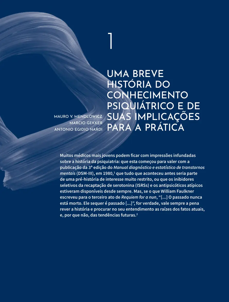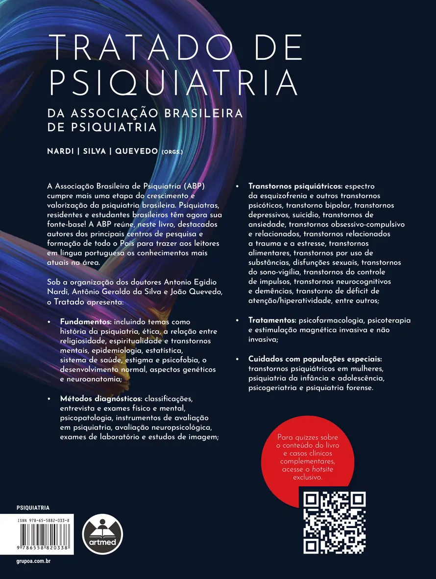 Sob a organização dos doutores Antonio Egidio Nardi, Antônio Geraldo da Silva e João Quevedo, este livro, disponível nos formatos impresso e e-book, é composto por 46 capítulos que abordam desde os fundamentos da área – abrangendo temas como história da psiquiatria, ética, a relação entre religiosidade, espiritualidade e transtornos mentais, epidemiologia, estatística, sistema de saúde, estigma e psicofobia, o desenvolvimento normal, aspectos genéticos e neuroanatomia –; passando pelos métodos diagnósticos – classificações, entrevista e exames físico e mental, psicopatologia, instrumentos de avaliação em psiquiatria, avaliação neuropsicológica, exames de laboratório e estudos de imagem –; os transtornos psiquiátricos – espectro da esquizofrenia e outros transtornos psicóticos, transtorno bipolar, transtornos depressivos, suicídio, transtornos de ansiedade, transtornos obsessivo-compulsivos e relacionados, transtornos relacionados a trauma e a estresse, transtornos alimentares, transtornos por uso de substâncias, disfunções sexuais, transtornos do sono e da vigília, transtornos do controle de impulsos e da conduta, transtornos neurocognitivos e demências, transtorno de déficit de atenção/hiperatividade, entre outros –; os tratamentos disponíveis – psicofarmacologia, psicoterapia e estimulação magnética invasiva e não invasiva –; e, por fim, cuidados com populações especiais – transtornos psiquiátricos em mulheres, psiquiatria da infância e adolescência, psicogeriatria e psiquiatria forense. Inclui também um hotsite exclusivo, com casos clínicos e questões para testar os conhecimentos adquiridos.