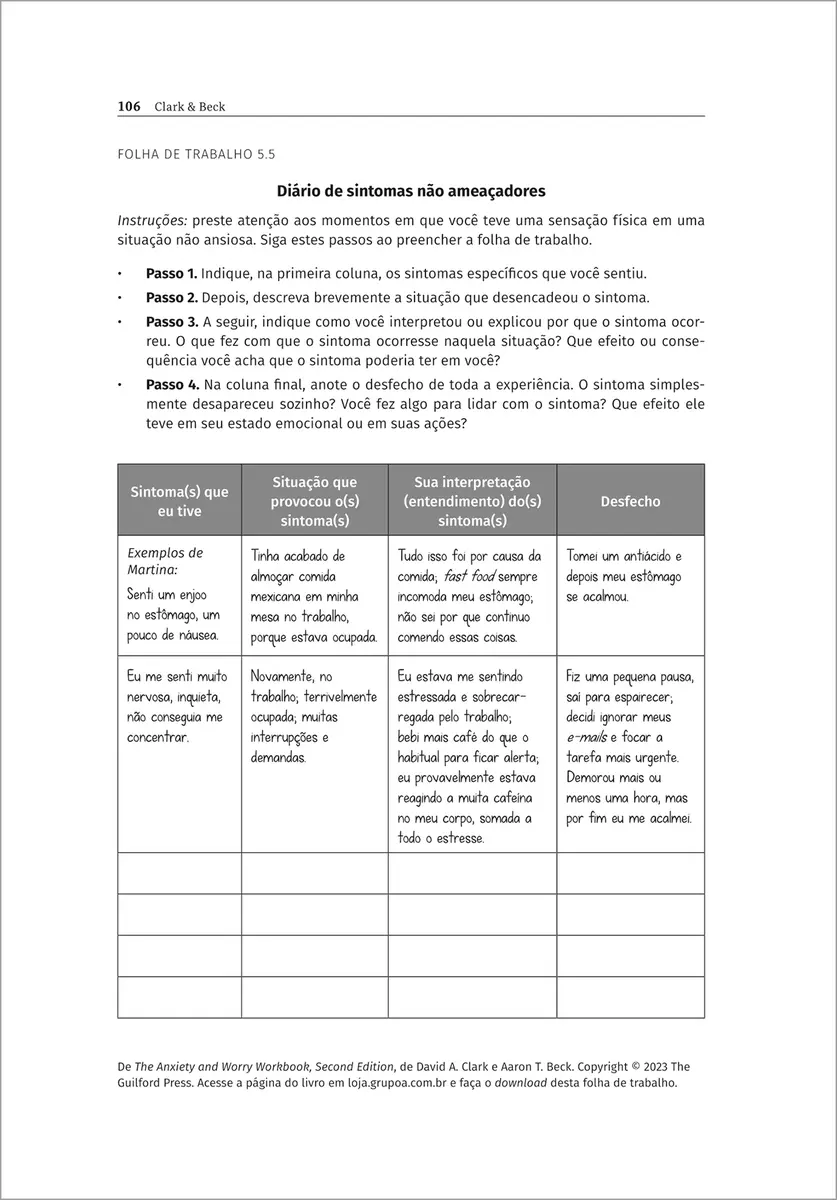 A ansiedade continua sendo um dos maiores problemas de saúde mental do mundo. Desde a 1ª edição deste guia, há mais de 10 anos, nos deparamos com um aumento da ansiedade relacionado, por exemplo, à pandemia de covid-19 e suas consequências. Isso impactou diretamente a vida de bilhões de pessoas em todo o mundo. Se você é uma delas e está buscando alívio duradouro para sua ansiedade fora de controle, este livro é para você.Nesta edição revisada e ampliada, o criador da terapia cognitivo-comportamental (TCC), Aaron T. Beck, e seu colega especialista em terapia cognitiva David. A. Clark apresentam técnicas, exemplos e exercícios para você identificar seus gatilhos de ansiedade, desafiar os pensamentos e crenças que levam à angústia e enfrentar com segurança as situações que você teme.